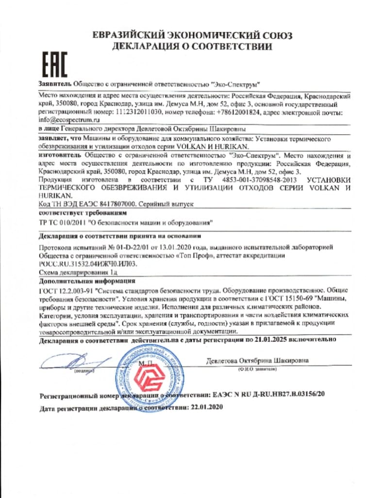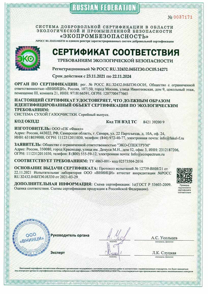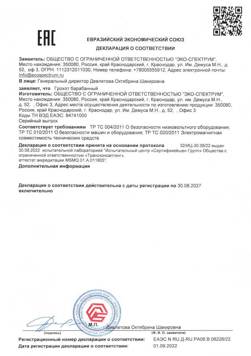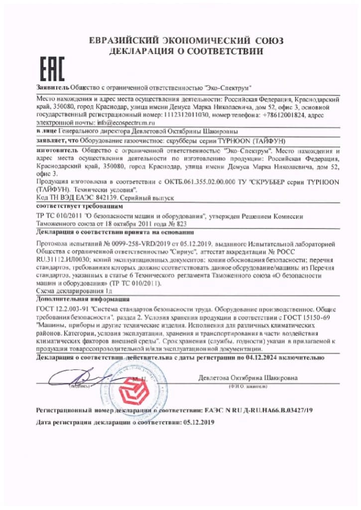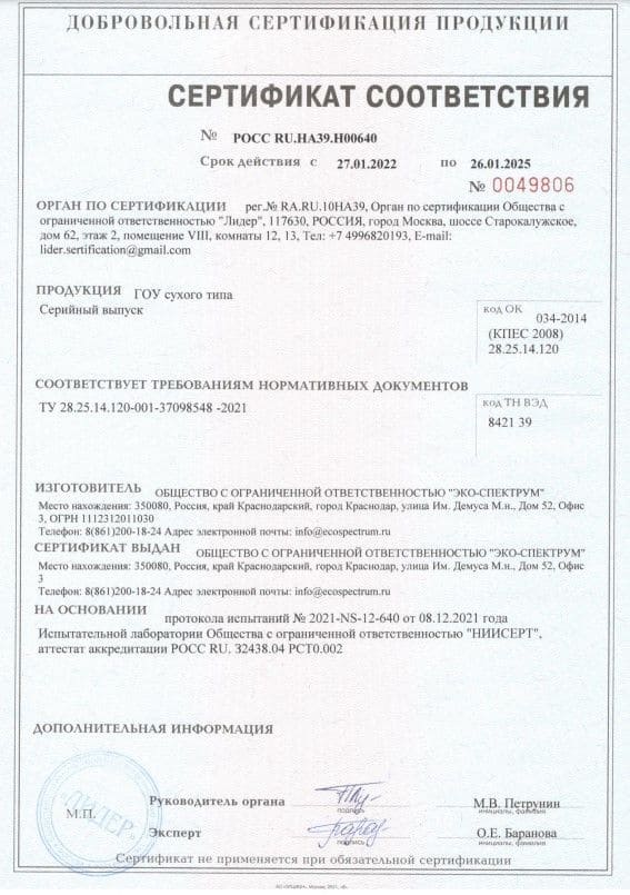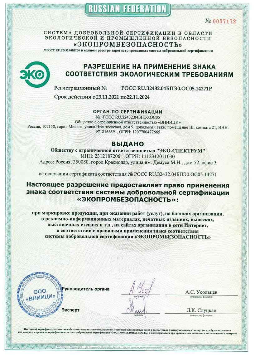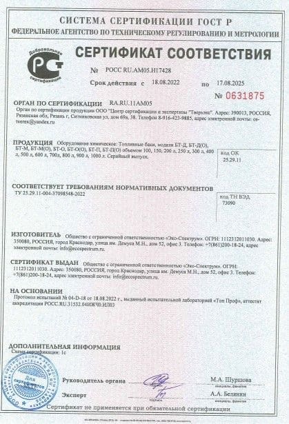 Yakıt depoları için uygunluk belgesi, modeller BT-D, BT-D(O), BT-M, BT-M(O), BT-O, BT-O(O), BT-P, BT-P(O) ) hacim 100, 150, 200 l., 250 l., 300 l., 400 l., 500 l., 600 l., 700 l., 800 l., 900 l., 1000 l. Eco-Spectrum LLC tarafından 08.18.22 tarihli 04-D-18 numaralı test raporuna dayanarak verilen seri üretim sertifikası.