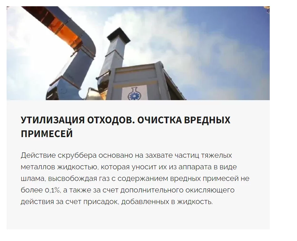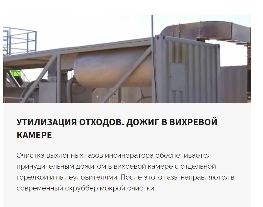 Система газоочистки установки ТДУ представлена циклоном и мокрым полым скруббером. Исходя из поддерживаемых температур в камере дожига и отсутствия каких-либо теплообменных аппаратов можно сделать вывод, что охлаждение дымовых газов перед циклоном происходит за счет разбавления продуктов сгорания атмосферным воздухом. Что требует установки более производительной системы газоочистки. В ином случае температуры обезвреживания по факту не соответствуют заявленным. Мокрый полый скруббер – самое дешевое, менее энергозатратное решение в системах мокрой газоочистки, соответственно менее эффективное по сравнению с другими вариантами.